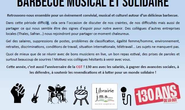 Barbecue musical et solidaire Lien direct vers le tract => cliquez ici Retrouvons-nous ensemble pour un évènement convivial, musical et culturel autour d’un délicieux barbecue. Dans cette période difficile, cela