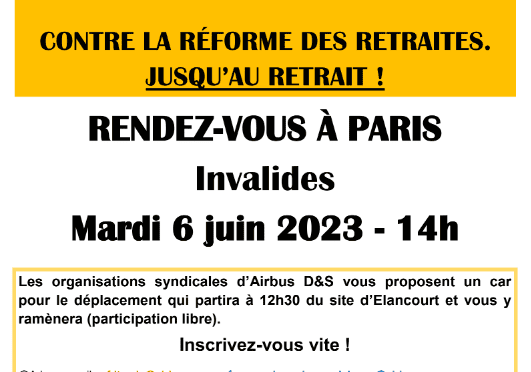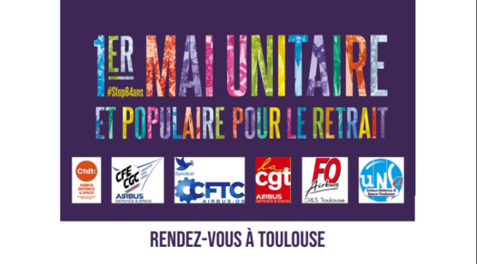 Voici ci desous le tract d’appel intesyndical pour AIRBUS DS Toulouse pour une 1er mai unitaire et populaire Manifestons le 1er mai ensemble pour exiger l’abandon de la retraite à