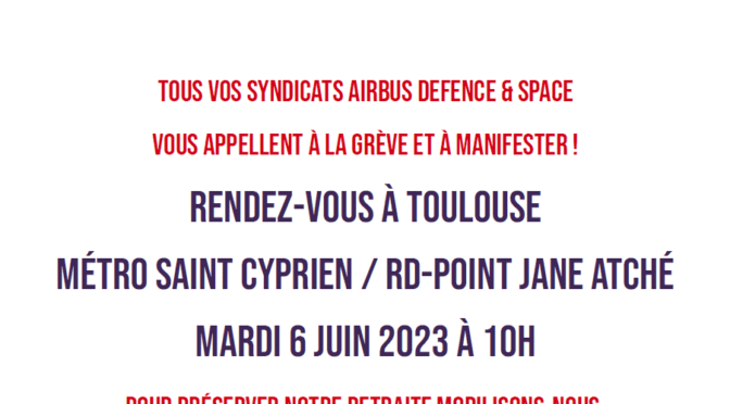 Retrouvez ici le tract distribué au cantines du Palays, d’Astro et devant GEO. Toutes les organisations syndicales d’AIRBUS DS à Toulouse appellent à se mettre en grève et à manifester